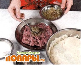 Положить на середину каждой лепешки фарш и защипать края таким образом, чтобы осталось отверстие.