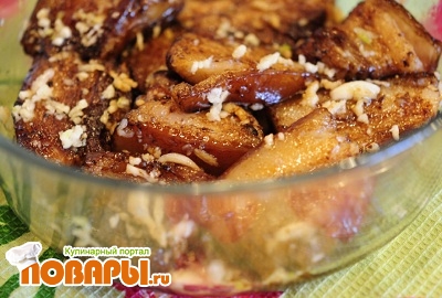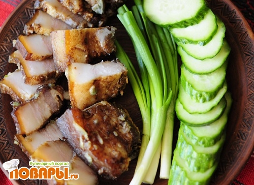 Затем сало вытащить из сковороды, подготовить для него удобную посуду. Сало нужно обмазать чесноком, пропущенным через чеснокадавку или мелко порубленным.