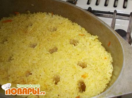 Всыпьте ,промытый под проточной водой, рис и аккуратно залейте его подсоленной чистой питьевой водой, чтобы вода покрывала рис ровно на два пальца выше. Дайте закипеть при большом огне, затем накройте казан крышкой и, прикрутив огонь до минимума, оставьте на 30 мин.