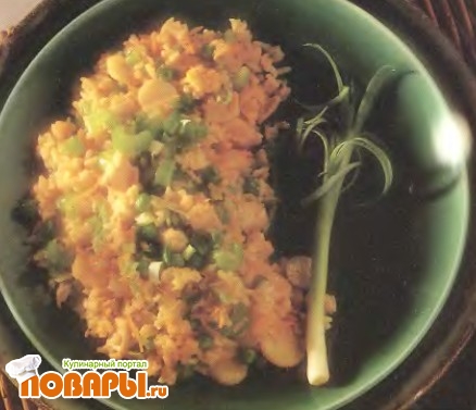 Добавить взбитые яйца и готовить 1 минуту. Затем положить зеленый лук. Сразу же подавать на стол, украсив стеблями зеленого лука.