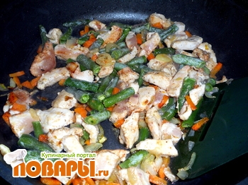 Если фасоль свежая - порезать на кусочки. Обжарить ее вместе с морковью, белым луком и мясом на масле.