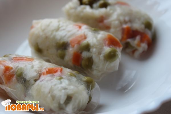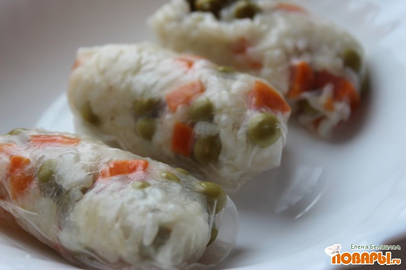 Если убрать рисовые рулетики в холодильник, то лучше их хорошо укрыть (засохнут), не складывать один на другой (прилипнут), слегка смочить водой или маслом растительным. После холодильника, если рулетики случайно подсохли, то смазываем их водой и подогреваем (для микроволновки). Рисовые рулетики можно обжарить во фритюре или на масле, подать с каким-нибудь соусом. Мы из соусов едим иногда соевый майонез.
