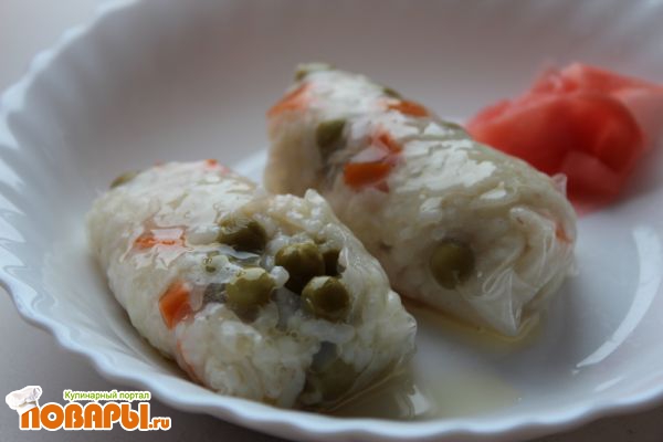 На лист выкладываем горстку рисовой начинки и сворачиваем как фаршированный блинчик. Также поступаем со всей рисовой бумагой и начинкой. Поливаем рисовые рулетики вкусным маслом (для меня кунжутное - вкусно и полезно), достаем имбирь маринованный, если есть. Мне нравится маринованный имбирь BLUE DRAGON.