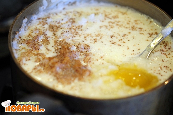 Далее, добавляем к рису 1 яичко, сливки, корицу. Внимание, если вы сомневаетесь, что ваш рис достаточно крахмаленый, самое время добавить ложечку желатина, разбавленного в горячей воде малого количества. И теперь опять, закрываем крышечку, периодически помешиваем, маленький газ. И так часик, пока вы точно не будите уверены, что рис полностью растворился а сливки испарились. Другими словами, поверх риса должна образоваться пленка.