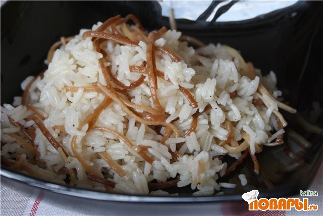 В кастрюле на среднем огне разогреваем сливочное масло и обжариваем вермишель, до потемнения.Сливаем рис, добавляем к вермишели, и жарим пару минут, покрывая рисинки маслом. Заливаем 1.5 стаканами горячей воды, солим, перчим черным молотым перцем, доводим до кипения.