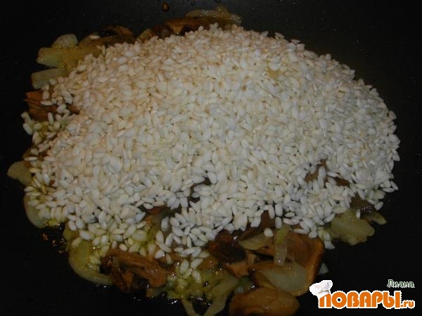 В литре теплой воды замочить на полчаса сушеные грибы. Отжать. Воду процедить и вскипятить, держать на слабом огне. Рис промыть хорошо под проточной водой, откинуть на дуршлаг. В оливковом масле довести до прозрачности порубленную соломкой луковицу. Всыпать грибы.