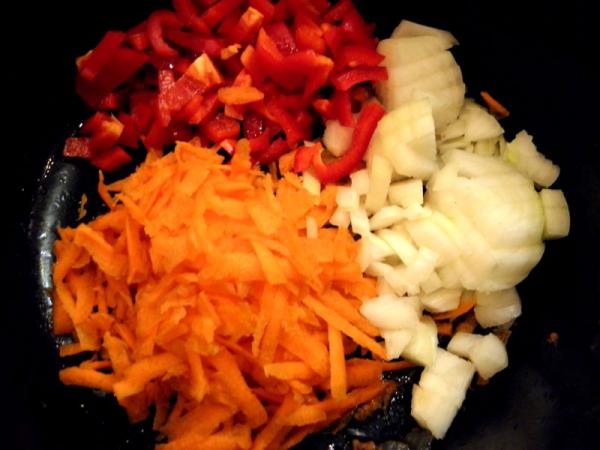 Нарезаем лук кубиками, натираем морковь на крупной терке, очищаем перец от плодоножки и семян, мелко нарезаем. Все это складываем в кастрюлю с толстым дном и притушиваем на растительном масле 10 минут.