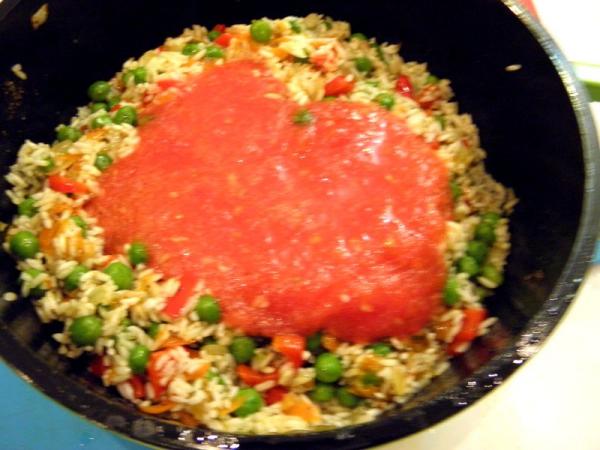 Насыпаем рис в большую, удобную посуду и промываем его в нескольких водах. Добавляем рис к жаренным овощам и прожариваем его вместе с овощами несколько минут.