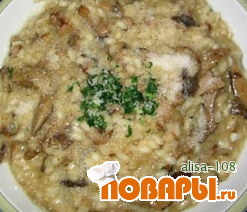 Добавить грибы и продолжать жарить. Добавить рис и обжаривать, постоянно помешивая, пока рис не станет прозрачным. По мере того, как рис будет впитывать жидкость, подливать воду, в которой замачивались грибы. Рис всегда должен быть покрыт водой.