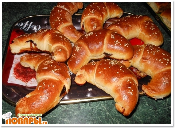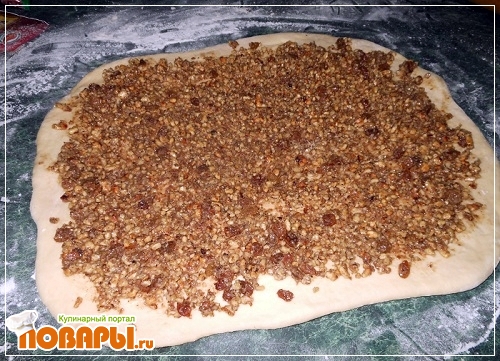 Взять немного теста, раскатать в прямоугольник и выложить ореховую начинку, свернуть тесто с обеих сторон прямоугольника к середине, и потом порезать на кусочки, перекрутить.