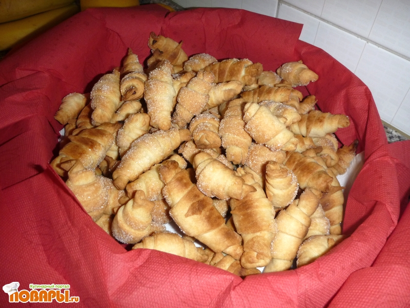 Из каждого шарика раскатываем круг, делим от центра на 16 частей, получатся треугольники, на широкую часть выклад. густой джем или нутеллу и закручиваем. Готовый рогалик обмакиваем верх. часть в сахар и отправляем на лист для выпекания. Выпекать при 180 25 мин.до легкого румянца.