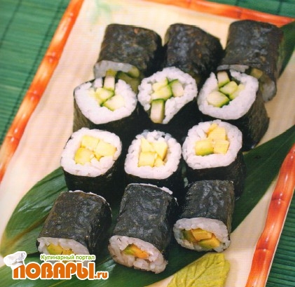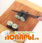 С помощью циновки свернуть нори с рисом и начинкой в тугой рулет. Выложить его на разделочную доску. Очень острый нож смочить водой и нарезать рулет на 6 кусочков шириной 1,5-2 см. Подавать с соевым соусом, васаби и маринованным имбирём.
