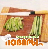 Отступив от нижнего края 1 см, выложить на рис 1-2 полоски огурца или авокадо.