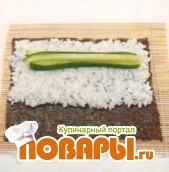 Лист нори положить на циновку-макису блестящей стороной вниз. Отступив от верхнего края 1,5-2 см, тонким ровным слоем выложить тёплый рис. Он должен покрывать не более 2/3 листа.