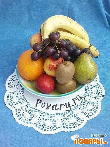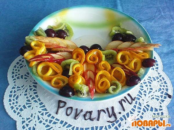 Фрукты моем,чистим и нарезаем кубиками.Виноград отделяем от веточек.Всё это выкладываем на блюдо с фруктовым декором.