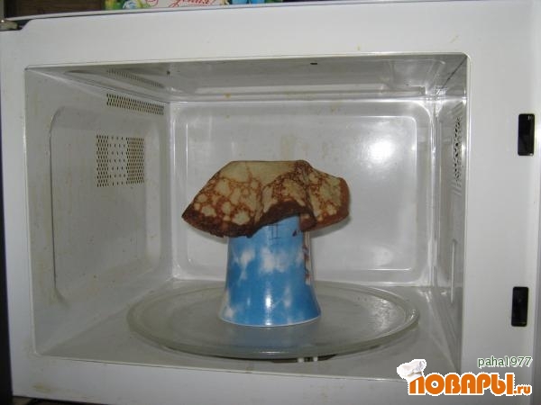 Затем берём блин, кладём его на кружку и ставим в микроволновку. Кружку надо ставить ровно посередине, иначе блин может неравномерно подсохнуть и подгореть.