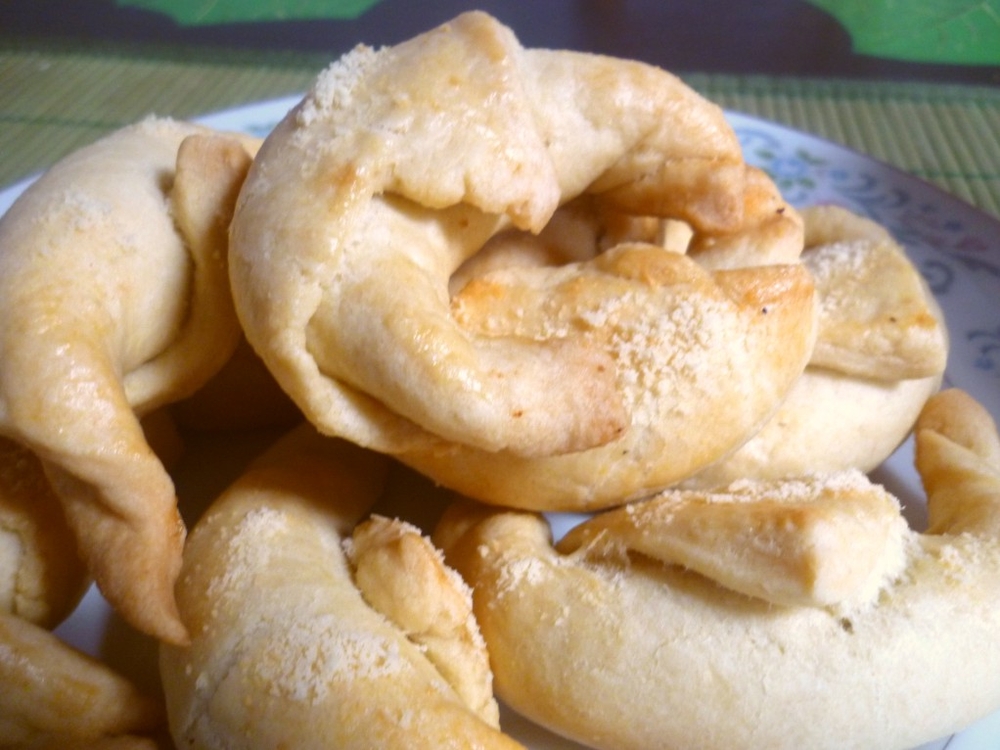 Дать тесту постоять минут 5, раскатать в пласт 0.3 см. нарезать на треугольники, положить ложечку начинки на основание треугольника и скрутить трубочки, затем подогнуть концы в форме "рожек"(по форме будут как мини круасаны), выложить на протвинь, слегка смазанный маслом, смазать белком, обсыпать пармезаном, выпекать до румяности.
