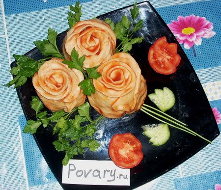Томатную пасту смешиваем с водой так, чтобы было не очень густо, и не очень жидко. Готовые розы, еще горячими погружаем ненадолго в кастрюльку с томатной пастой, чтобы окрасить их в нежно-розовый цвет.