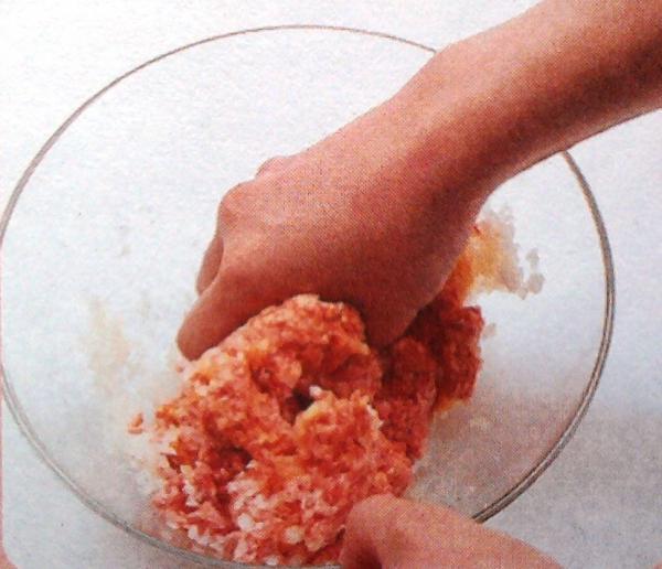 В миску положить муку, сбрызнуть сакэ и перемешать, встряхивая. Добавить фарш, сакэ, яйцо и соль(список А), вручную смешать все и замешать до липкого загустения.