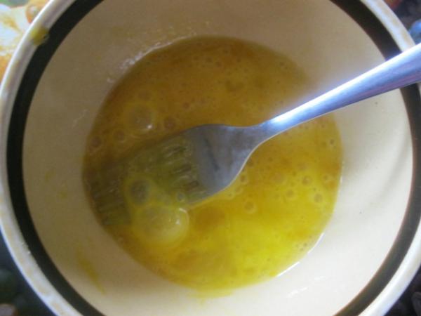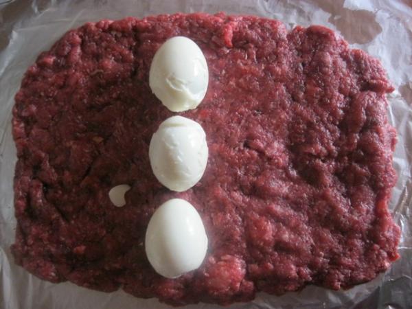Получившийся фарш посолить, поперчить, добавить специи и добавить половину взбитого яйца. Хорошо перемешать. Распределить по фольге, положить сверху очищенные вареные яйца. Скатать рулет.