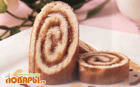 Готовую основу снимите с противня и, переложив на пергамент, сверните рулет. Выдержите 5-10 минут. Затем осторожно разверните, смажьте джемом, повидлом или вареньем, вновь сверните рулет, охладите.