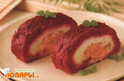 На салфетку, посыпанную сухарями, выложите слой овощей, затем слой творожной массы и слой из кураги, сверните рулет.
