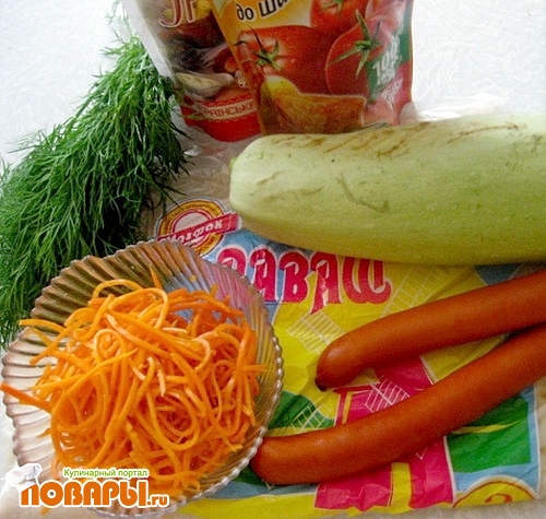 Колбасу и кабачок нарезать кольцами, нашинковать зелень и натереть молодой картофель на крупной тёрке (предварительно очистив его от кожуры).