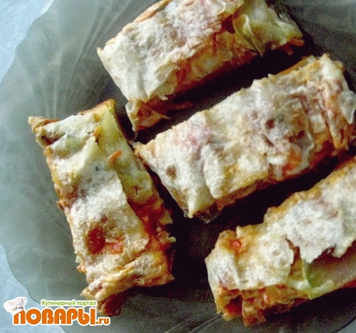 Лаваш смазать майонезом и равномерно разместить по нему тертый картофель, сверху резанную кольцами колбасу и кабачок.