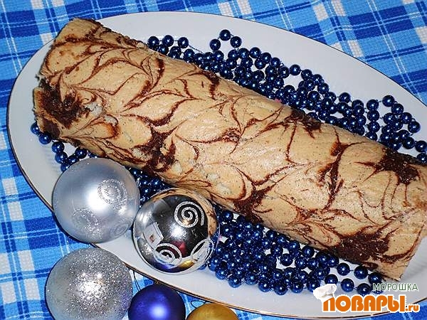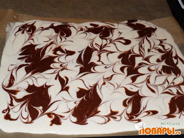 Противень выстелить пекарской бумагой.Тесто равномерно распределить по ней.Шоколадное тесто хаотично распределить по белому тесту.Взять зубочистку или спичку,и провести по тесту вдоль и поперек.