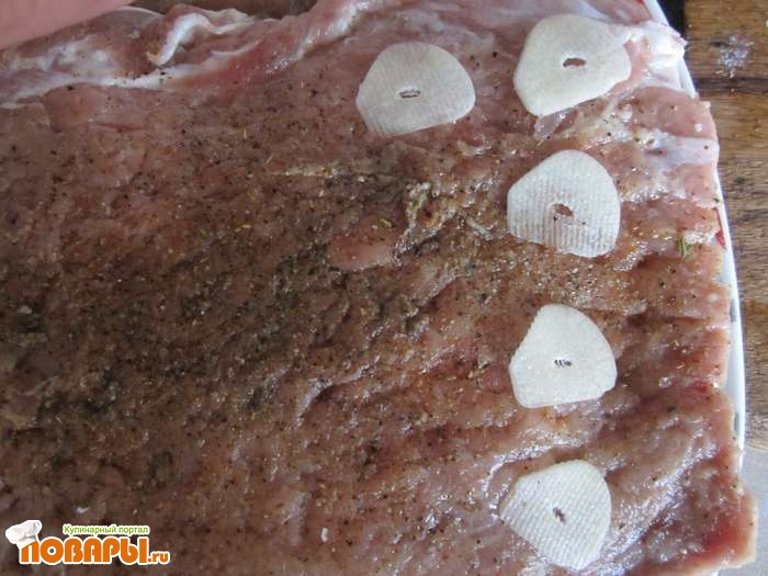 Дальше мясо перчим и солим по вкусу - основа для рулета готова. Потом берем зубчики чеснока и нарезаем их тоненькими пластинками, выкладываем на мясо.