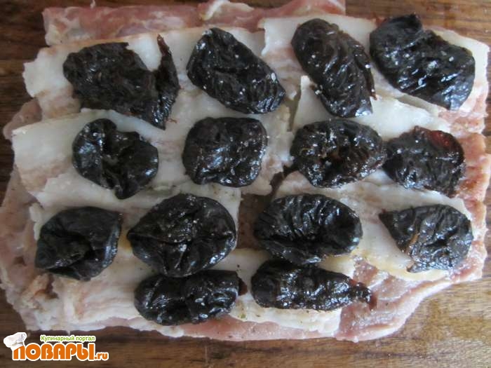 Дальше выкладываем тонко нарезанный бекон. Отдельно необходимо подготовить чернослив, помыть его и залить теплой водой, чтобы он стал немного мягче. Чернослив необходимо выложить слоем на слой бекона.