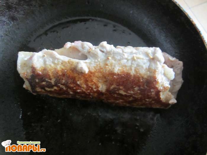 Аккуратно скручиваем рулет и фиксируем его с помощью зубочисток. Дальше рулет необходимо обжарить на сковородке с двух сторон, до тех пор, пока его бока не станут румяными.