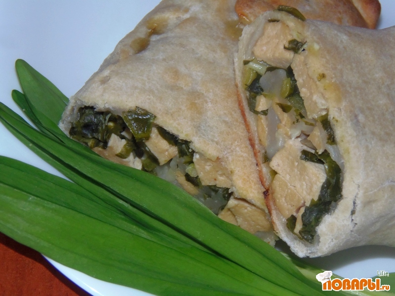 Когда тесто отлежится, делим его на части (у меня получилось 4), раскатываем тонкие лепешки (где-то около 2-4 мм), выкладываем на них начинку и заворачиваем плотный рулет.