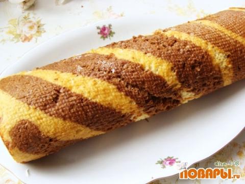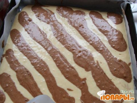 Выливаем белое тесто, а из шоколадного наносим полосы.