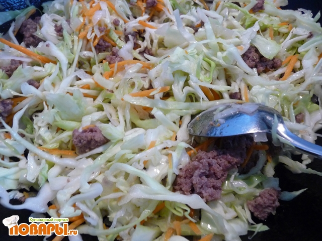 Фарш обжарить с мелко порезанным луком до полуготовности, затем добавить мелко нашинкованную капусту и тертую морковь. Продолжаем обжаривать на слабом огне до готовности, солим, перчим, добавляем карри.