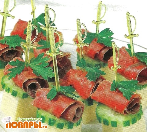 Ломтики лосося сверните рулетиками и каждый вместе с кружочком огурца прикрепите шпажкой к сырному кубику. Оформите зеленью.
