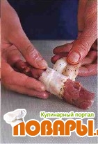 Вырезку разрежьте вдоль пополам, но не прорезая до конца, чтобы кусок можно было раскрыть как книгу. Накройте сложенной в несколько раз пленкой и отбейте в пласт толщиной не более 1,5 см. Смажьте с внутренней стороны маслом, оставьте на 15 мин.