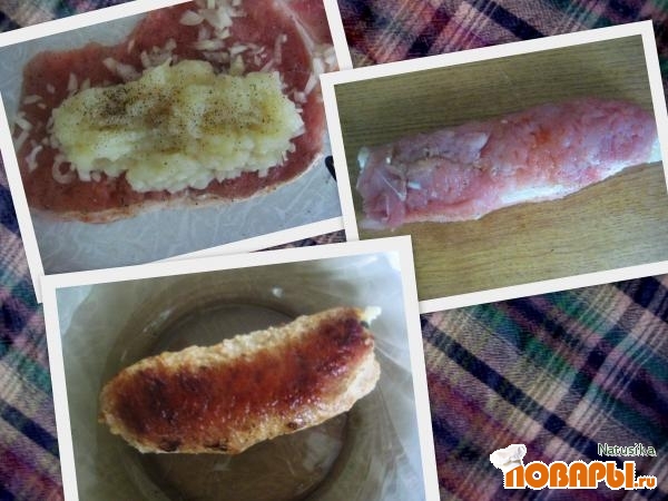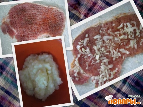 Свинину нужно хорошо отбить, посолить и поперчить с обеих сторон. Картофель отварить и сделать из него пюре (пюре сделать немного водянистым и посолить). Нашинковать лук и тонким слоем выложить на отбитую свинину,