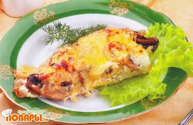 Выложить грибы на рыбу, полить слегка подсоленной сметаной, посыпать крупно натертым сыром. Можно сбрызнуть маслом с толчеными сухарями. Поместить в нагретый духовой шкаф и запечь до зарумянивания сыра.