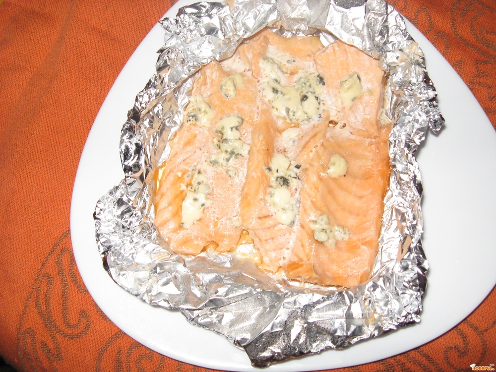Из рыбы удалить кости. Разрезать на порционные куски. Каждую порцию уложить на кусок фольги. Сверху разложить тонко порезанный сыр с плесенью. Солить рыбу не нужно!