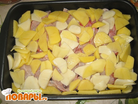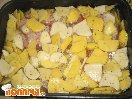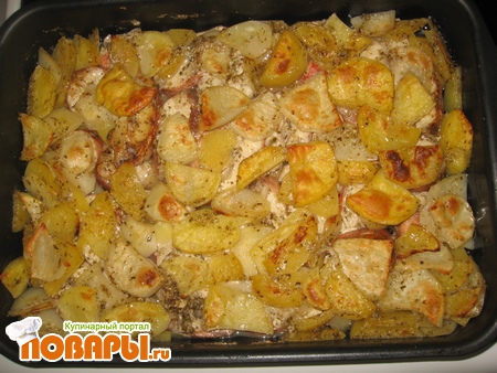 Посолить, поперчить, посыпать орегано. Выжать ско двух лимонов на картофель с рыбой. Сбрызнуть блюдо растительным маслом. Добавить 1,5 чашки воды.
