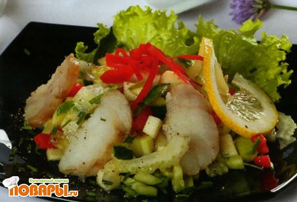 Подготовленные продукты соединить, по вкусу посолить и поперчить, заправить майонезом, смешанным с лимонным соком.
