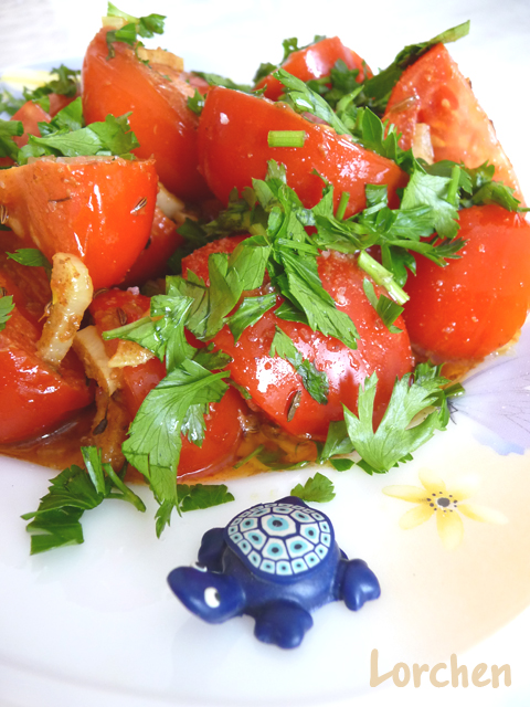 Помидоры разрезать на 4 части, добавить к маслу со специями. Также добавить крупно порезанный чеснок. Помидоры должны согреться и стать мягче.