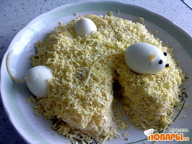 Мышки - это отварные яйца.Глазки - перец гоошком.Ушки и хвостики - сыр.