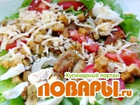 Существует множество рецептов этого салата, напишу какой любят в моей семье.порвать листья салата, кусочки яиц, обжарить в панировке курицу, сухарики с чесноком, немножко помидора и тёртый сыр . Заправить маслом и соком лимона