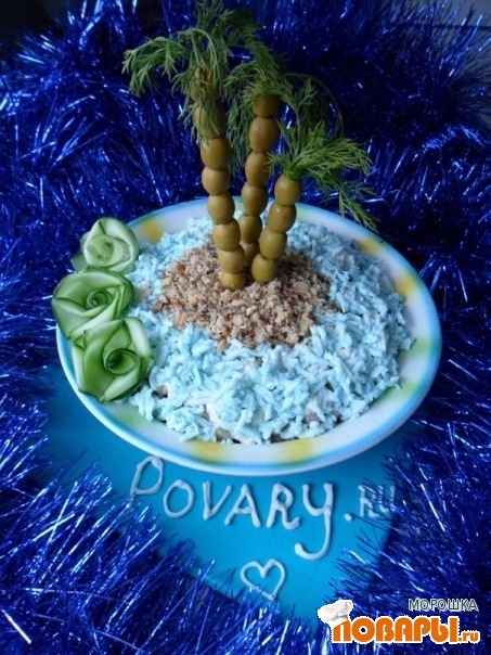 Середину блюда оформить измельчёнными грецкими орехами (очень удобно раскатать орехи скалкой!)Это остров.
