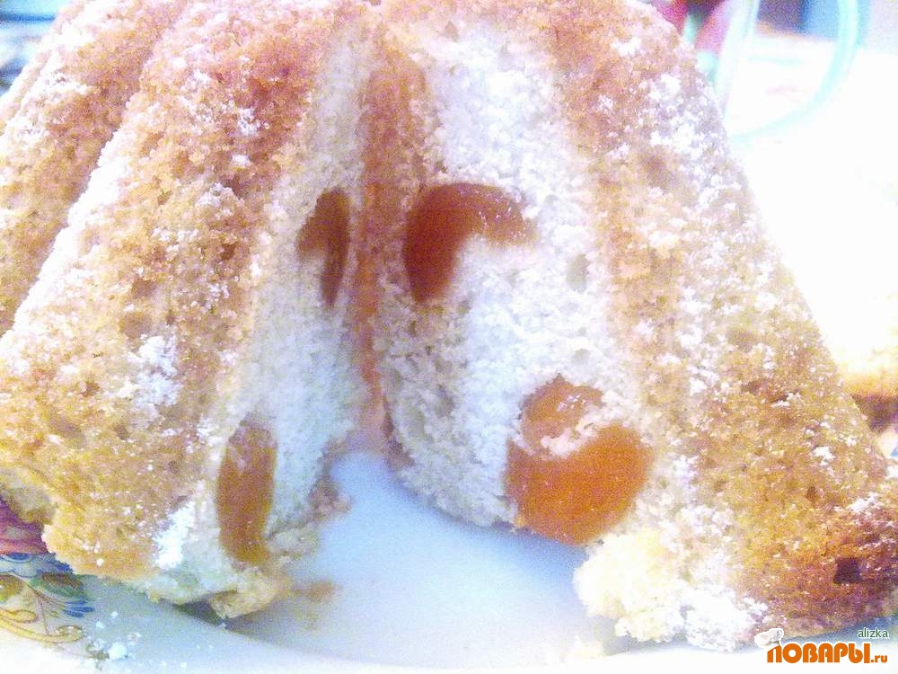 Вынуть кекс из формы, полить оставшимся соком из под абрикосов или любым сиропом. После пропитки присыпать сахарной пудрой.