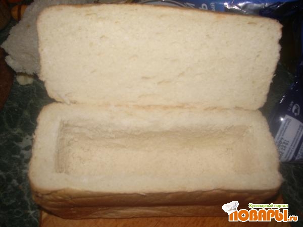 Берем буханку хлеба, аккуратно срезаем крышку, стараемся сделать это не до конца..у меня к сожалению не получилось, сильно отрезала Вырезаем серединку.