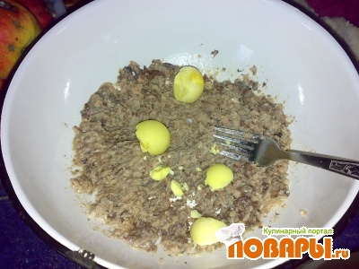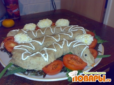 Змейка: Сардины и 2 желтка размять вилкой, добавить тертый картофель и 2 плавленых тертых сырка. Добавить 50 грамм масла, немного майонеза, чеснок, посолить и поперчить. Все хорошо перемешать до однородной массы.