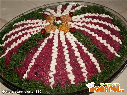 Самый верхний слой - оставшаяся свекла,которая выкладывается не просто верхним слоем,нужно обмазать ей бока салата.
